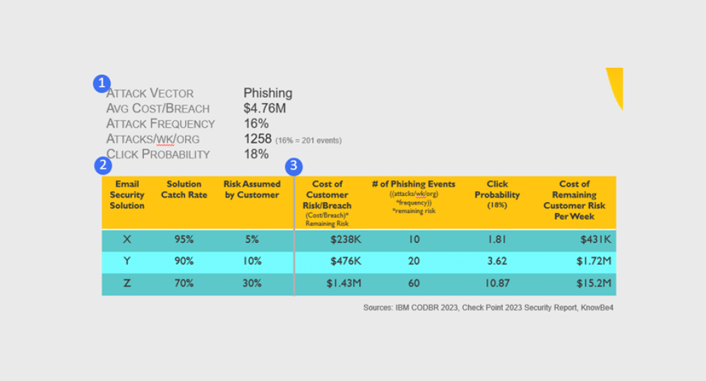 Agora, consideremos uma organização que enfrenta 1.258 tentativas de phishing todas as semanas. Com uma frequência de ataque de 16%, isto equivale a 201 potenciais violações. O custo médio de um ataque bem-sucedido, conforme relatado pela IBM, é atualmente de 4,76 milhões de dólares. Se tivermos em conta a probabilidade de clique, que atualmente é de 18% para os funcionários com formação e de 35% para os funcionários sem formação, as implicações financeiras do risco residual são enormes.