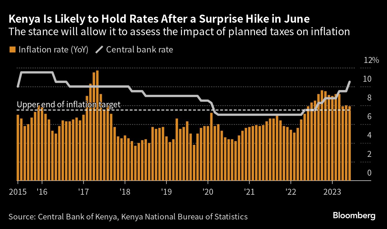 Os impostos que deveriam começar em 1º de Julho para financiar o orçamento do governo para 2023-24 foram congelados até que um tribunal decida sobre sua legalidade e podem impedir que a inflação volte ao intervalo da meta do banco central até Outubro, como previsto por seu novo governador, Kamau Thugge.