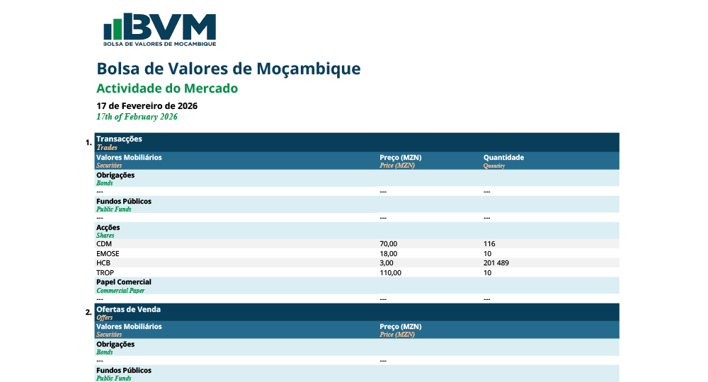 A Bolsa de Valores de Moçambique (BVM) registou uma sessão de actividade moderada no dia 17 de Fevereiro de 2026, marcada por estabilidade nos preços das principais acções cotadas e ausência de movimentos bruscos no mercado secundário.