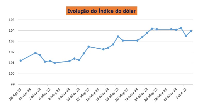 Legenda: O gráfico acima ilustra a evolução do índice do dólar norte-americano numa base diária de 28 de Abril a 02 de Junho de 2023.