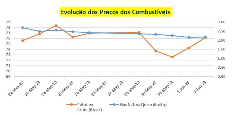 Legenda: O gráfico acima ilustra a evolução dos preços do petróleo bruto (Brent) em dólares por um barril, e do Gás Natural em dólares por um milhão de unidades térmicas britânicas (do lado direito), de 15 a 26 de Maio de 2023.