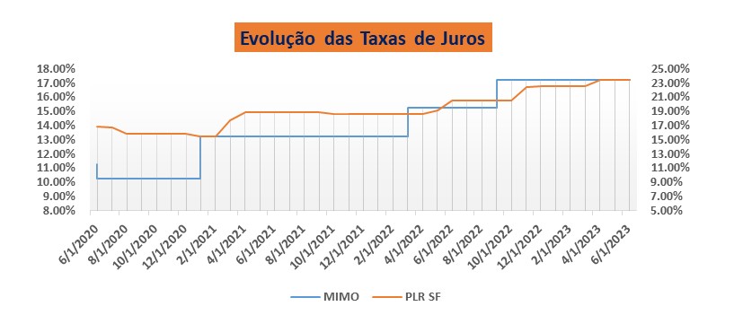 Legenda: O gráfico acima ilustra a evolução da Taxa de Juro de Politica Monetária (MIMO), e a Prime Rate do Sistema Financeiro (eixo direto). De dois a dois meses, a partir de Junho de 2020 a Junho de 2023.