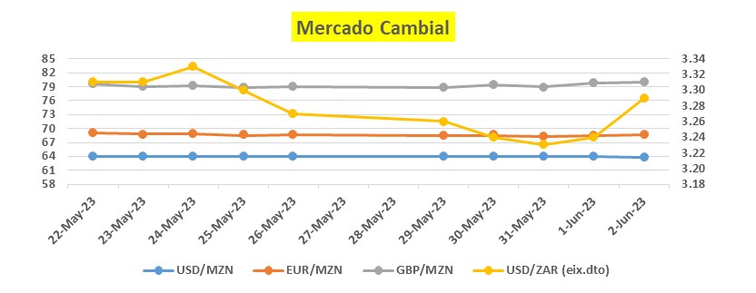 Legenda: O gráfico acima ilustra as variações dos câmbios médios (de valorimetria) das moedas mais transacionadas no mercado Moçambicano (USD, ZAR, EUR, GBP) face ao Metical, numa base diária de 29 de Maio a 02 de Junho de 2023.