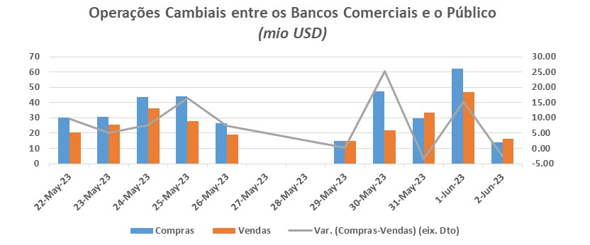 Legenda: O gráfico acima ilustra as variações dos volumes das operações cambiais entre os bancos comerciais e o público, em milhões de dólares norte-americanos, numa base diária de 22 de Maio a 02 de Junho de2023.