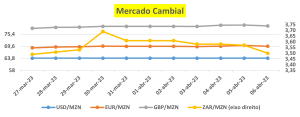Legenda: O gráfico acima ilustra as variações dos câmbios médios (de valorimetria) das moedas mais transacionadas no mercado Moçambicano (USD, ZAR, EUR, GBP) face ao Metical, numa base diária de 27 de Março 06 de Abril de 2023.