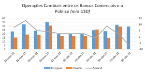 Fonte: Banco de Moçambique Legenda: O gráfico acima ilustra as variações dos volumes das operações cambiais entre os bancos comerciais e o público, em milhões de dólares norte-americanos, numa base diária de 27 de Março a 06 de Abril de 2023.