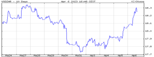 Legenda: O gráfico acima ilustra a evolução do rand sul africano por uma unidade do dólar norte-americano, de 24 de Março a 06 de Abril de 2023.