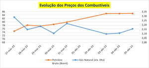 O gás natural esteve numa tendência maioritariamente negativa, tendo esta commodity saído de USD 2.29/MMBTU no inicio da semana passada para USD 2.16/MMBTU no fecho da semana em analise. Ao contrário do gás natural, o petróleo bruto (Brent), foi transacionado em alta, tendo saído de USD 74.62/barril no inico da sessão semanal anterior, para USD 84.99/barril, no fecho da sessão semanal em analise.