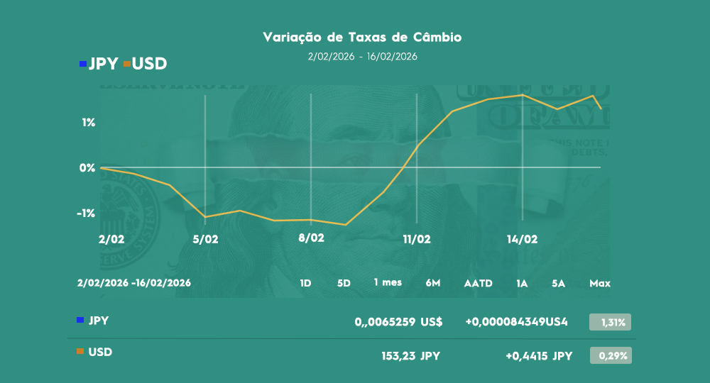Neste contexto, o Yen japonês iniciou a semana em ligeira correcção, negociando em torno de 153 por dólar, após ter acumulado valorização de quase 3% na semana anterior — o maior ganho semanal em cerca de 15 meses .