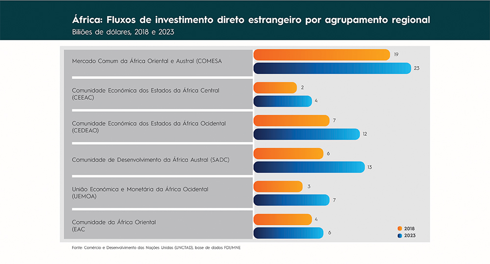 Em comparação com 2018, os fluxos de IDE expandiram-se para todos os principais grupos regionais, principalmente a Comunidade Económica dos Estados da África Ocidental (CEDEAO) e a Comunidade de Desenvolvimento da África Austral (SADC).