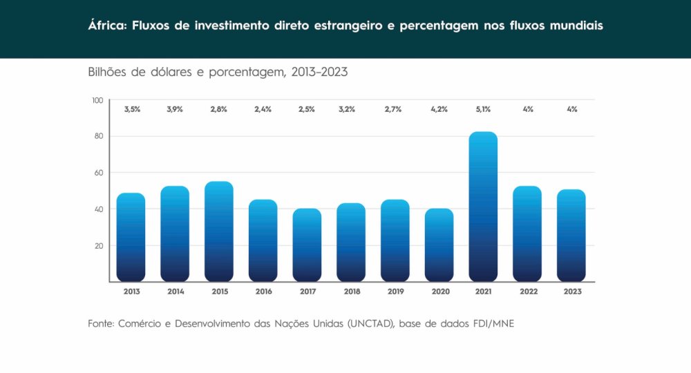 O Relatório de Investimento Mundial da UNCTAD, recentemente tornado público, indica que o valor estimado dos acordos internacionais de financiamento de projectos em países africanos diminuiu 50%, para 64 mil milhões de dólares. Isso segue uma queda de 20% em 2022.