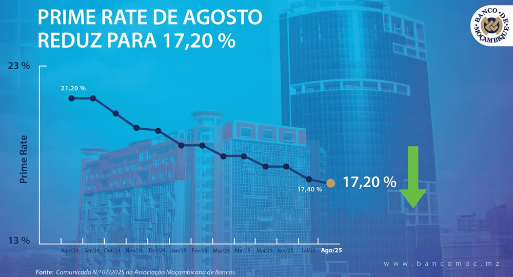 - Prime Rate do sistema financeiro moçambicano permanece em 17,20% para Agosto de 2025;