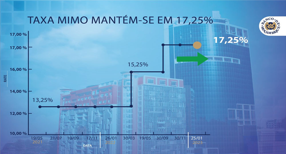 O Comité de Política Monetária (CPMO) do Banco de Moçambique decidiu manter a taxa de juro de política monetária, taxa MIMO, em 17,25 %. De acordo com o órgão, a decisão é sustentada pelo surgimento de novos riscos e incertezas associados às projecções da inflação, com destaque para o potencial impacto do actual conflito no Médio Oriente sobre os preços internacionais de combustíveis e alimentos.